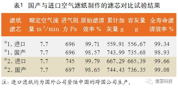 在此,僅以空氣濾紙的質(zhì)量為例,反映國(guó)產(chǎn)濾紙與進(jìn)口濾紙的質(zhì)量差異。見(jiàn)表1。